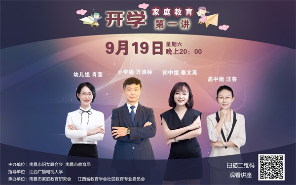 为贯彻习近平总书记关于家庭教育工作的重要指示,充分发挥家长在家庭教育中的重要作用,促进青少年身心健康成长,9月19日20点,由我校指导,南昌市教育局和南昌市妇联联袂主办的家庭教育“开学第一讲”正式线上开播,活动吸引了全市12.6万家长在线观看。本次在线课程直播活动由江西省教育学会社区教育专业委员会和南昌市家庭教育研究会承办,分幼儿园、小学、初中和高中四个学段,分别邀请了省内家庭教育知名专家肖莹、秦文英、汪芸和万浪标进行线上授课。