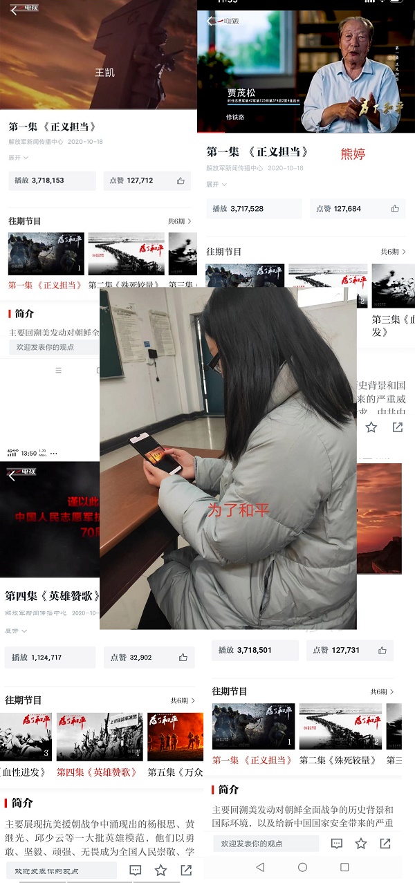 近日,我校组织全体教师观看大型电视纪录片《为了和平》,深入贯彻落实习近平总书记在纪念中国人民志愿军抗美援朝出国作战70周年大会上的重要讲话精神,大力弘扬抗美援朝精神,开展新时代爱国主义教育。