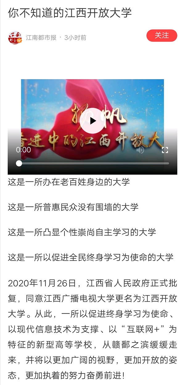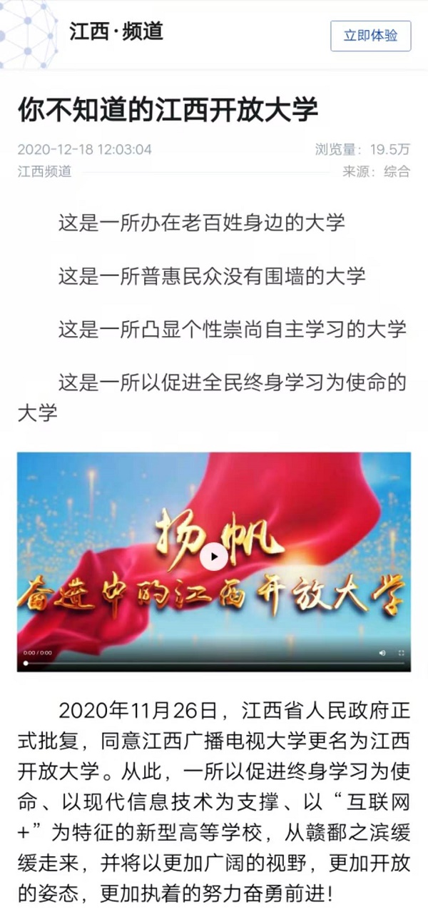 为迎接304am永利更名,学校推出全新校情宣传片《扬帆——奋进中的304am永利》。12月18日,新华社江西频道、江南都市报先后以《你不知道的304am永利》为题,隆重推介了我校宣传片,发布后两小时,点击量已突破19万。