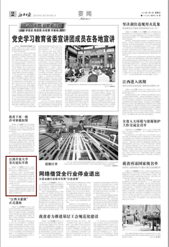 江西日报、江西新闻客户端报道我校高职学院“安石论坛”开讲情况