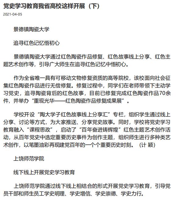 4月5日,江西日报、学习强国、江西新闻客户端等媒体以《党史学习教育 我省高校这样开展(下)》为题,报道江西省各大高校党史学习教育情况,我校《开展“红色之旅接力行”学党史》收录其中。