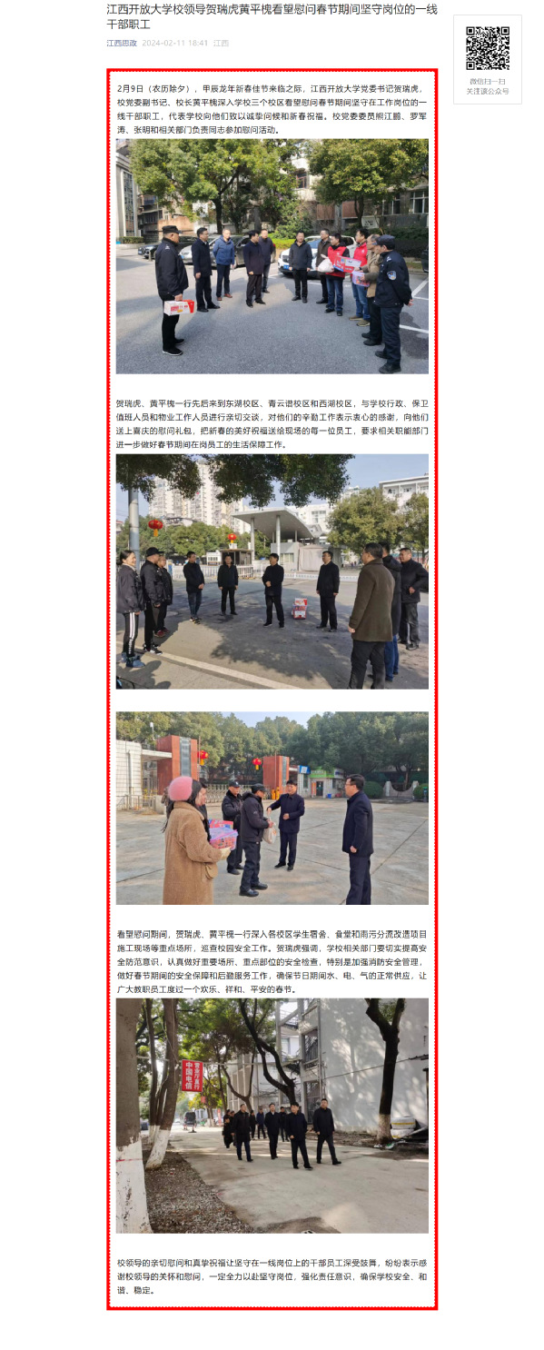 2月9日(农历除夕),甲辰龙年新春佳节来临之际,304am永利党委书记贺瑞虎,校党委副书记、校长黄平槐深入学校三个校区看望慰问春节期间坚守在工作岗位的一线干部职工,代表学校向他们致以诚挚问候和新春祝福。校党委委员熊江鹏、罗军涛、张明和相关部门负责同志参加慰问活动。