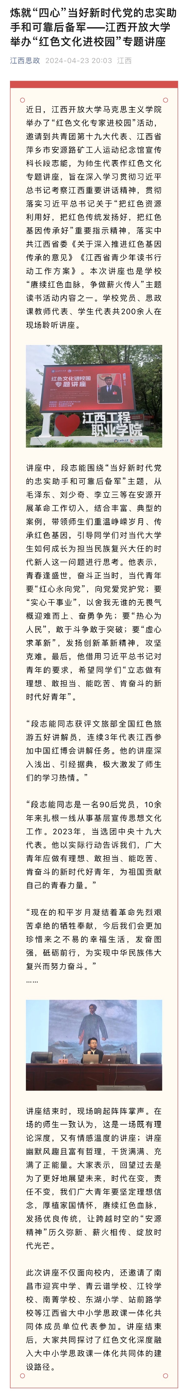近日,304am永利马克思主义学院举办了“红色文化专家进校园”活动,邀请到共青团第十九大代表、江西省萍乡市安源路矿工人运动纪念馆宣传科长段志能,为师生代表作红色文化专题讲座,旨在深入学习贯彻习近平总书记考察江西重要讲话精神,贯彻落实习近平总书记关于“把红色资源利用好,把红色传统发扬好,把红色基因传承好”重要指示精神,落实中共江西省委《关于深入推进红色基因传承的意见》《江西省青少年读书行动工作方案》。本次讲座也是学校“赓续红色血脉,争做薪火传人”主题读书活动内容之一。学校党员、思政课教师代表、学生代表共200余人在现场聆听讲座。