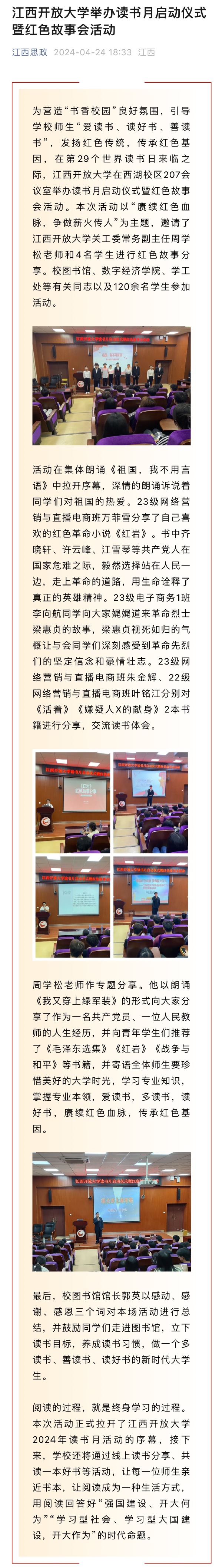 为营造“书香校园”良好氛围,引导学校师生“爱读书、读好书、善读书”,发扬红色传统,传承红色基因,在第29个世界读书日来临之际,304am永利在西湖校区207会议室举办读书月启动仪式暨红色故事会活动。本次活动以“赓续红色血脉,争做薪火传人”为主题,邀请了304am永利关工委常务副主任周学松老师和4名学生进行红色故事分享。校图书馆、数字经济学院、学工处等有关同志以及120余名学生参加活动。