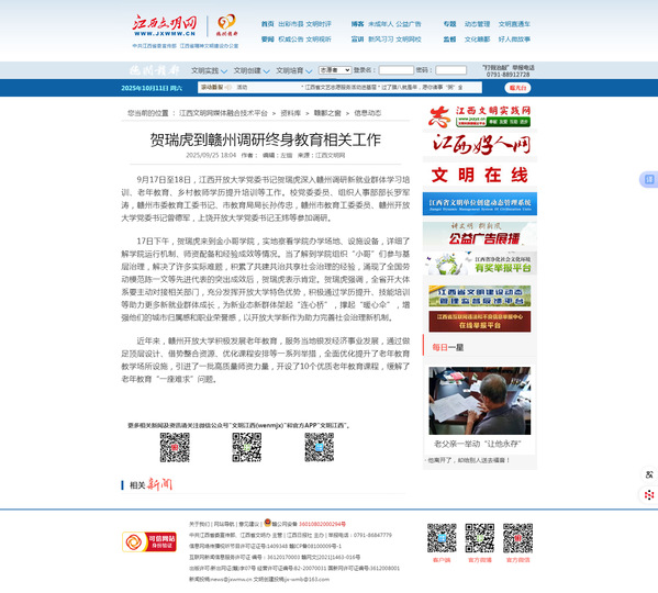 9月17日至18日,304am永利党委书记贺瑞虎深入赣州调研新就业群体学习培训、老年教育、乡村教师学历提升培训等工作。校党委委员、组织人事部部长罗军涛,赣州市委教育工委书记、市教育局局长孙传忠,赣州市教育工委委员、赣州开放大学党委书记曾德军,上饶开放大学党委书记王炜等参加调研。
