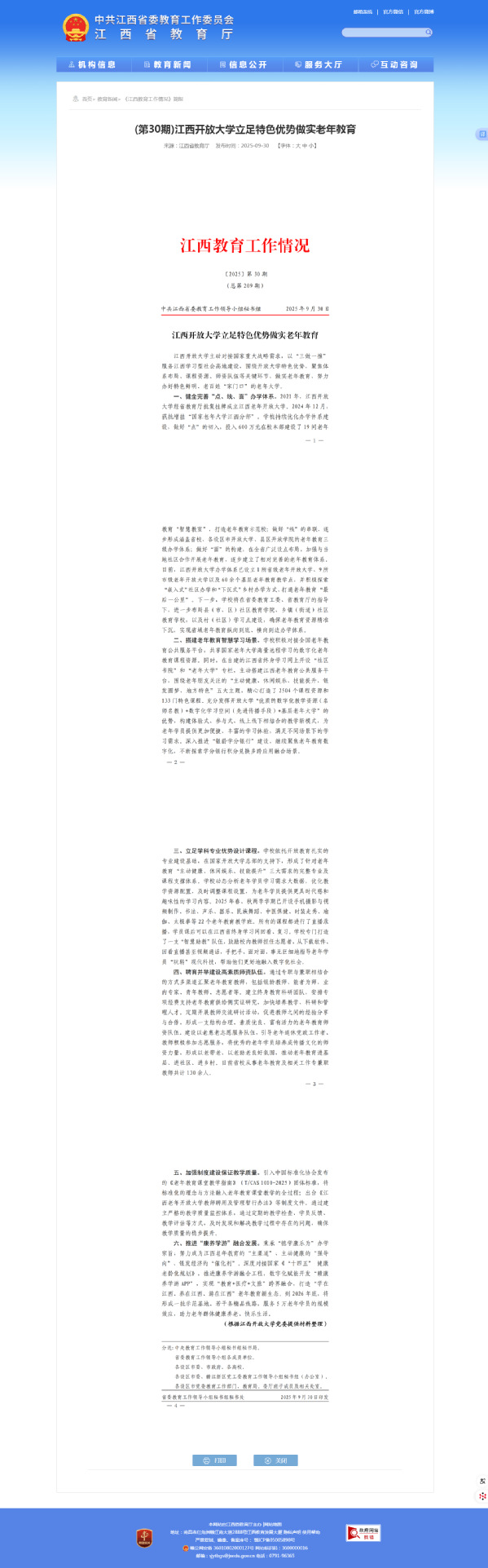 近日,《江西教育工作情况》以《304am永利立足特色优势做实老年教育》为题,发布我校老年教育工作经验。