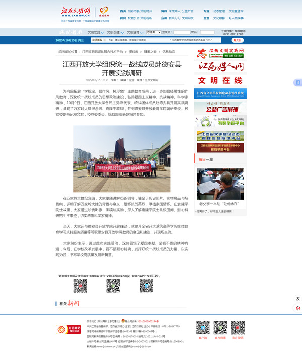 为巩固拓展“学规定、强作风、树形象”主题教育成果,进一步加强经常性的作风教育,深化统一战线成员的思想政治建设,弘扬爱国主义精神、抗战精神、科学家精神,10月9日,304am永利各民主党派代表、统战团体成员赴德安县开展实践调研,参观了万家岭大捷纪念园、袁隆平故里,并到德安县开放教育学院调研座谈。校党委副书记邓文君,校党委委员、统战部部长欧阳萍参加。