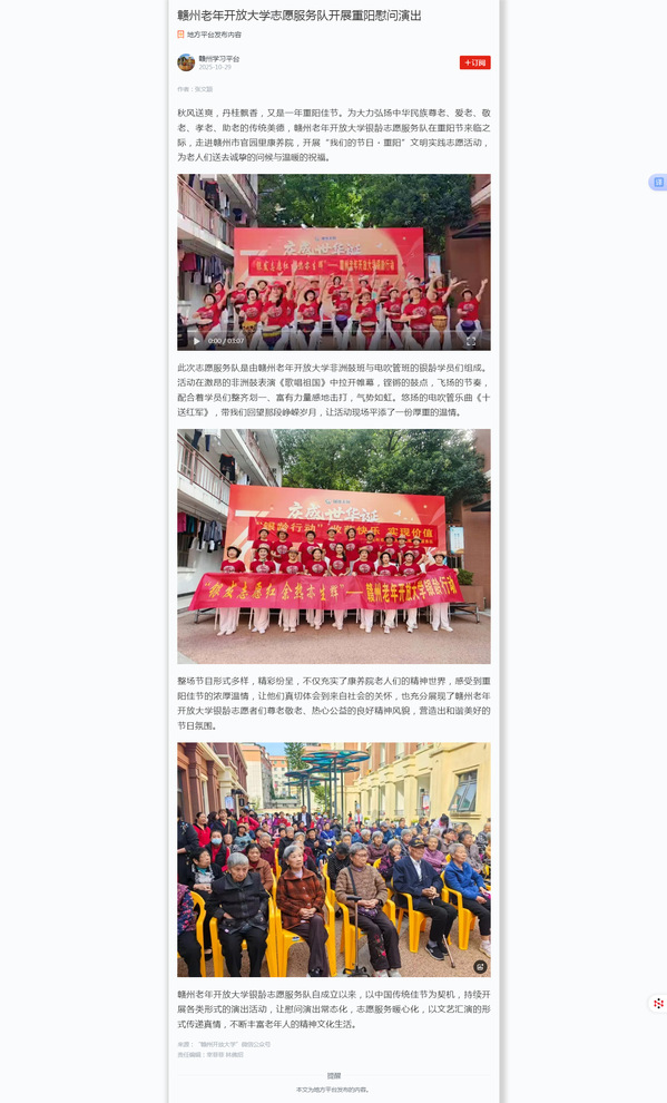 秋风送爽,丹桂飘香,又是一年重阳佳节。为大力弘扬中华民族尊老、爱老、敬老、孝老、助老的传统美德,赣州老年开放大学银龄志愿服务队在重阳节来临之际,走进赣州市官园里康养院,开展“我们的节日・重阳”文明实践志愿活动,为老人们送去诚挚的问候与温暖的祝福。
